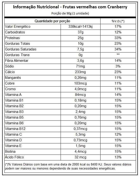 Darkness Whey Bar ? Barra proteica sabor frutas vermelhas com Cranberry e cobertura sabor Iogurte. Contém aromatizantes sintéticos idênticos aos naturais. Colorido artificialmente. Ingredientes: Caseinato de cálcio, cobertura sabor iogurte, recheio de frutas vermelhas diet. (Suco de maçã, polpa de morango, polpa de amora, polpa de framboesa, água, amido, aroma sintético idêntico ao natural e sorbato de potássio ? conservante), xarope de maltitol, colágeno hidrolisado, cranberry desidratado, xarope de polidextrose, óleo de palma, triglicerídeos de cadeia média, proteína isolada do soro do leite, proteína concentrada do leite, fruto-oligossacarídeo, mix de vitaminas A (palmitato de retinol), B9 (ácido fólico), C (ácido ascórbico), H (biotina), B3 (niacina), E (acetato de tocoferol), B5 (pantotenato de cálcio), D (colecalciferol), B12 (cianocobalamina), B2 (riboflavina), B6 (piridoxina) e B1 (tiamina mononitrato), cloreto de sódio, mix de minerais (cobre, cromo e manganês), glicerina (umectante), aromas sintéticos idênticos aos naturais, lecitina de soja (emulsificante), ácido cítrico (acidulante), sorbato de potássio (conservante) e ponceau (corante artificial). ALÉRGICOS: CONTÉ LACTOSE E SOJA. NÃO CONTÉM GLÚTEN.