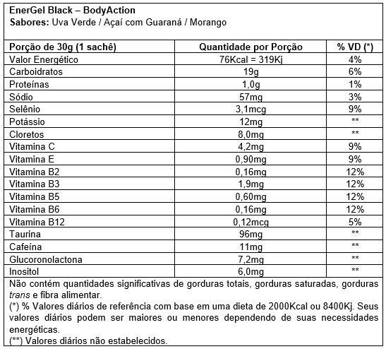 Energel Black é formulado com um mix completo de carboidratos em suas diferentes formas, como a Palatinose, Frutose, D-Ribose e Waxy Maize, que garantem o aporte energético ideal para antes, durante e depois das atividades físicas. Sua absorção de forma gradual e contínua, retarda a fadiga precoce e mantém a reposição de glicogênio muscular. Adicionado de eletrólitos, mantém o equilíbrio isotônico garantindo um melhor desempenho e recuperação. Contém cafeína, que mantém o estado de alerta ativo e ainda dá o pique necessário para o melhor rendimento nas atividades. Energel BLack é indicado para atletas de todas as modalidades esportivas que necessitam de uma boa fonte de energia para otimizar a performance durante o treinamento ou competição. Por estar na forma de gel, favorece uma absorção equilibrada, evitando o desconforto que pode ser causado pela sensação de estômago pesado.