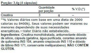 Creatina monohidratada, cápsula (gelatina, água purificada, corantes amarelo de quinoleína, amarelo crepúsculo e dióxido de titânio, conservante INS 218). NÃO CONTÉM GLÚTEN.